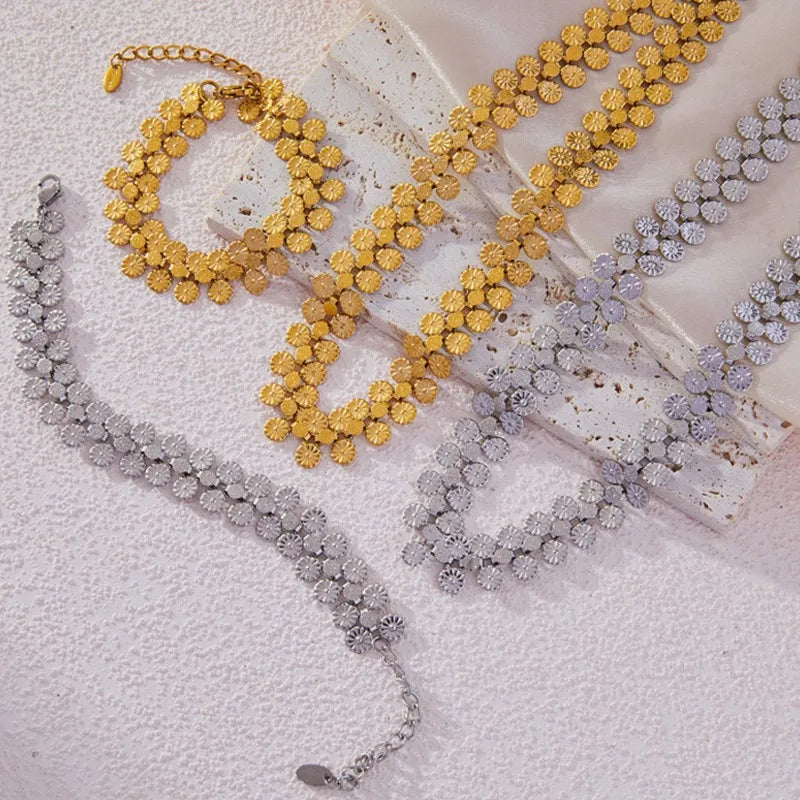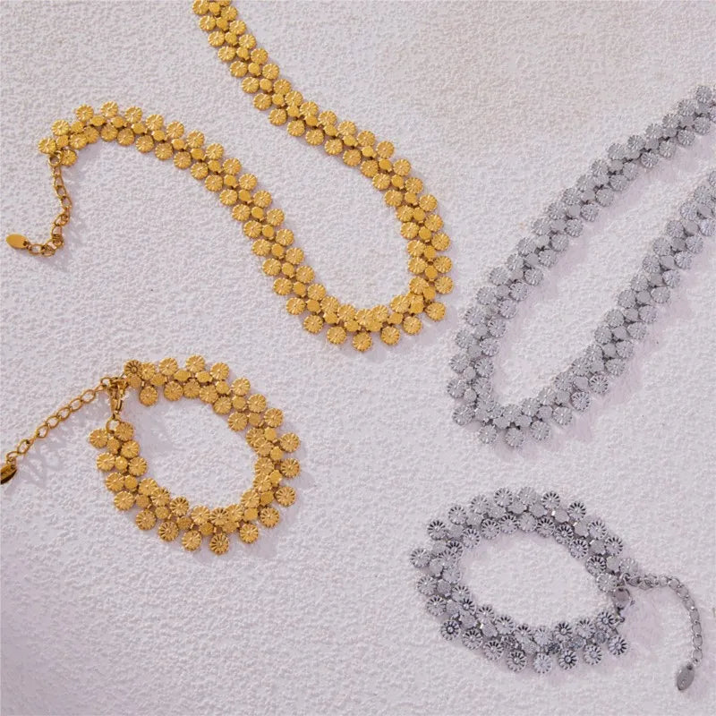 Add a touch of effortless bohemian charm to your style with this beautiful Multi-Flower Necklace & Bracelet Set. Made from high-quality stainless steel and coated in long-lasting gold plating, this set is waterproof, tarnish-resistant, and made for everyday wear — no fading, no rust, no green skin.