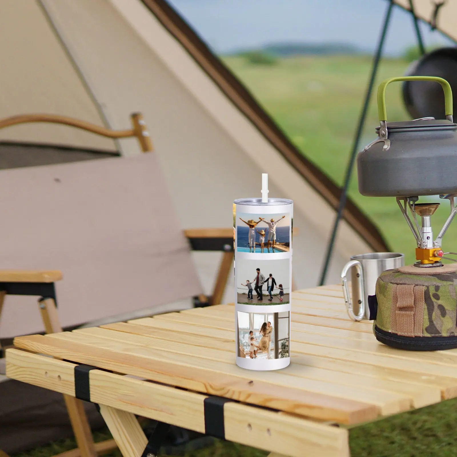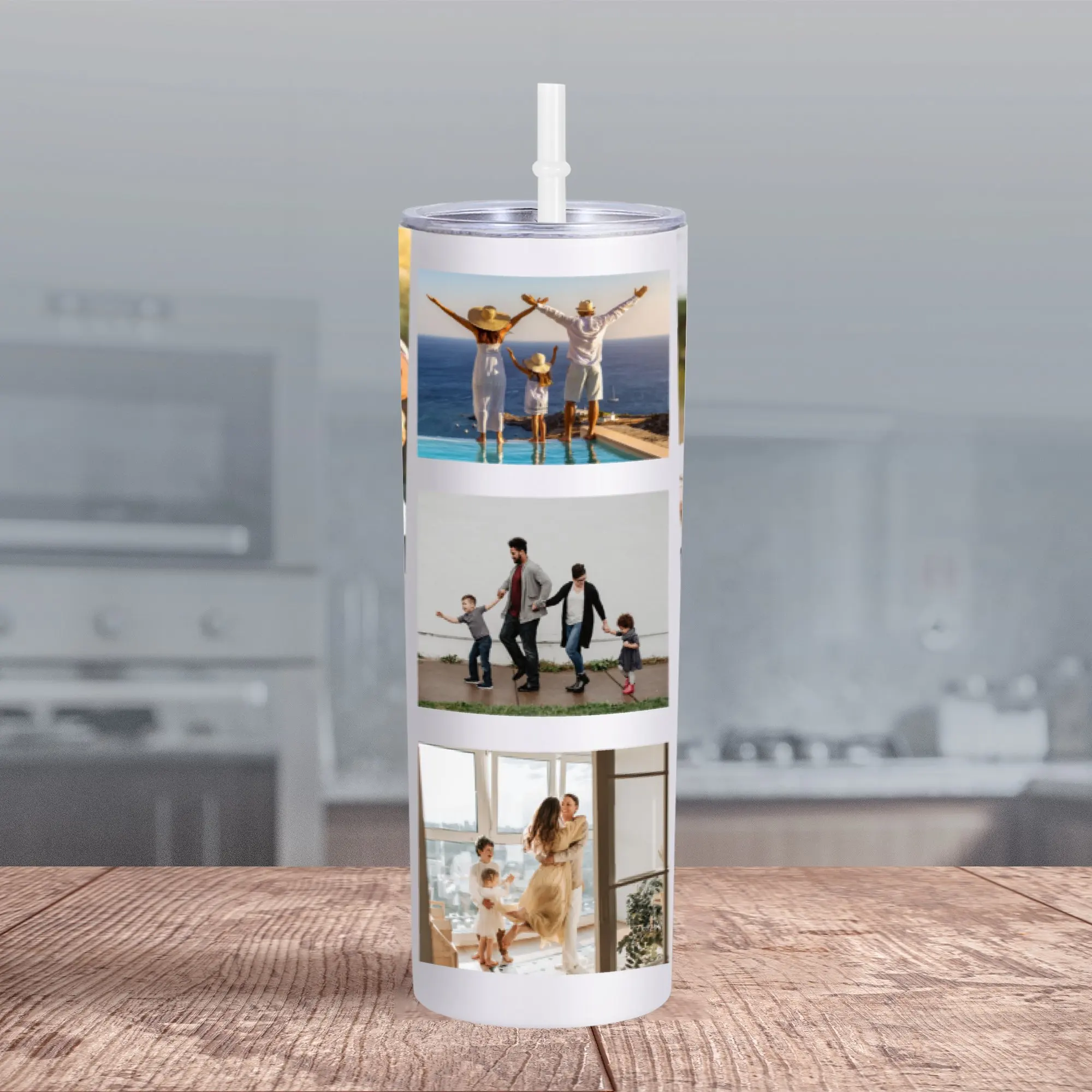 Experience the joy of sharing precious memories with your loved ones with our Custom 5 Photo Thermos Cup! This 20oz Skinny Tumbler comes with a convenient Straw Lid for on-the-go sipping. It makes the perfect Christmas and Birthday Gift for your dear Dad, Mom, Son, or Daughter, and is also a must-have for any travel adventure.