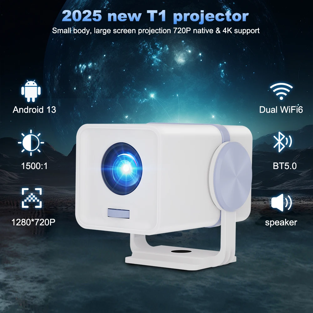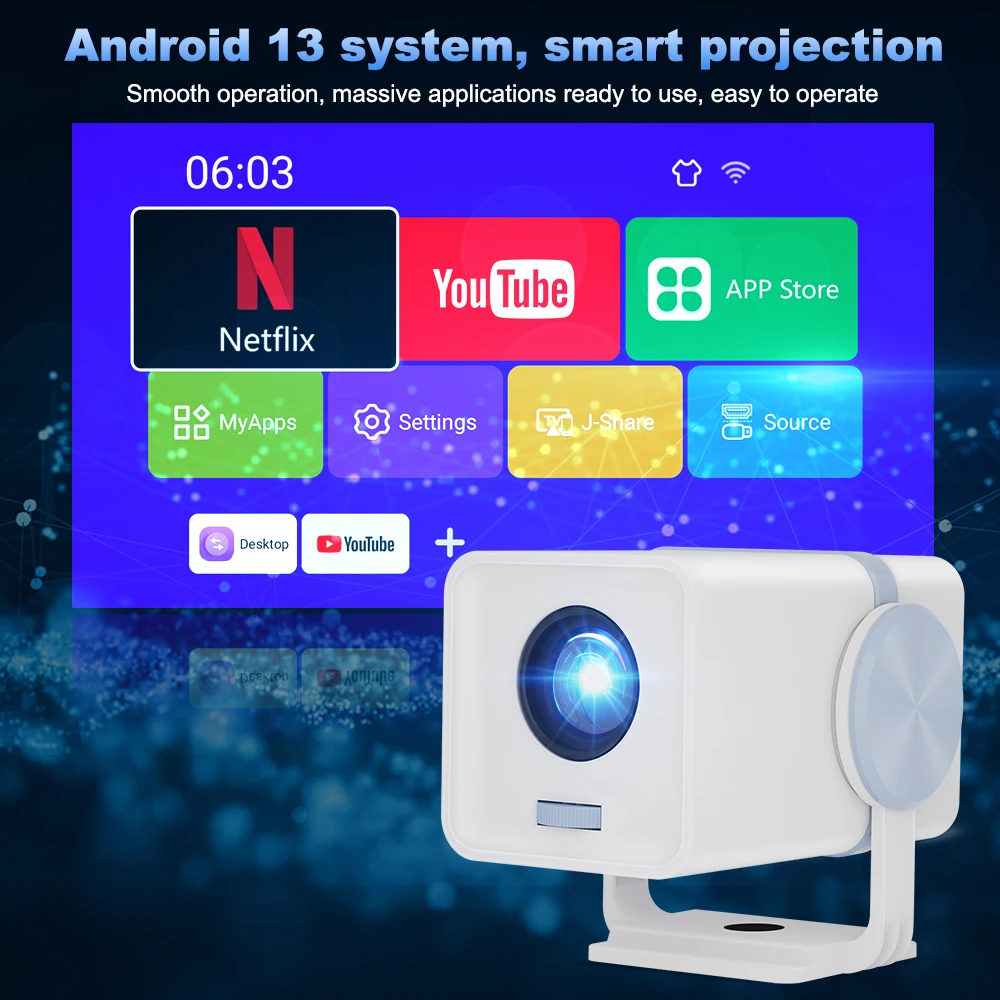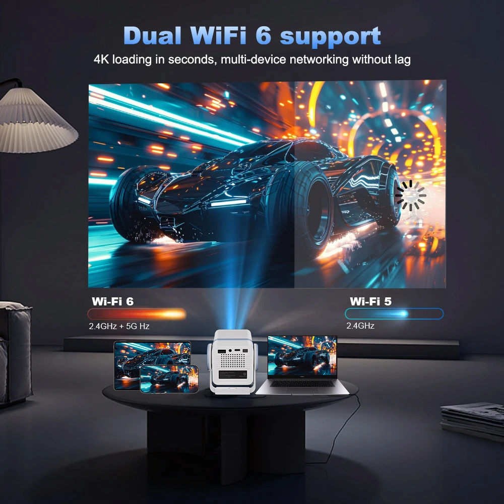 Bring cinema-quality entertainment wherever you go with the DESS Portable Smart Projector – designed for home theaters, office presentations, outdoor movie nights, and more. Packed with the latest Android 13 OS and cutting-edge Wi-Fi 6 + Bluetooth 5.0 technology, this compact powerhouse delivers seamless streaming, vibrant visuals, and ultimate portability.