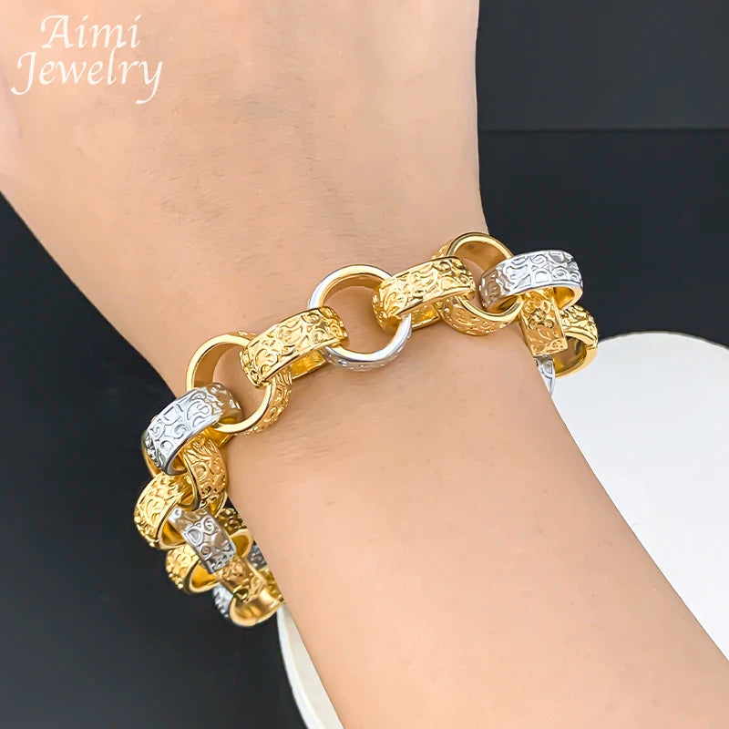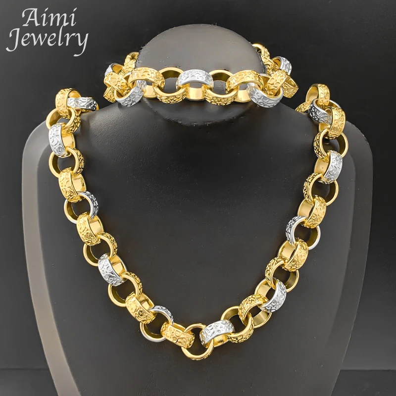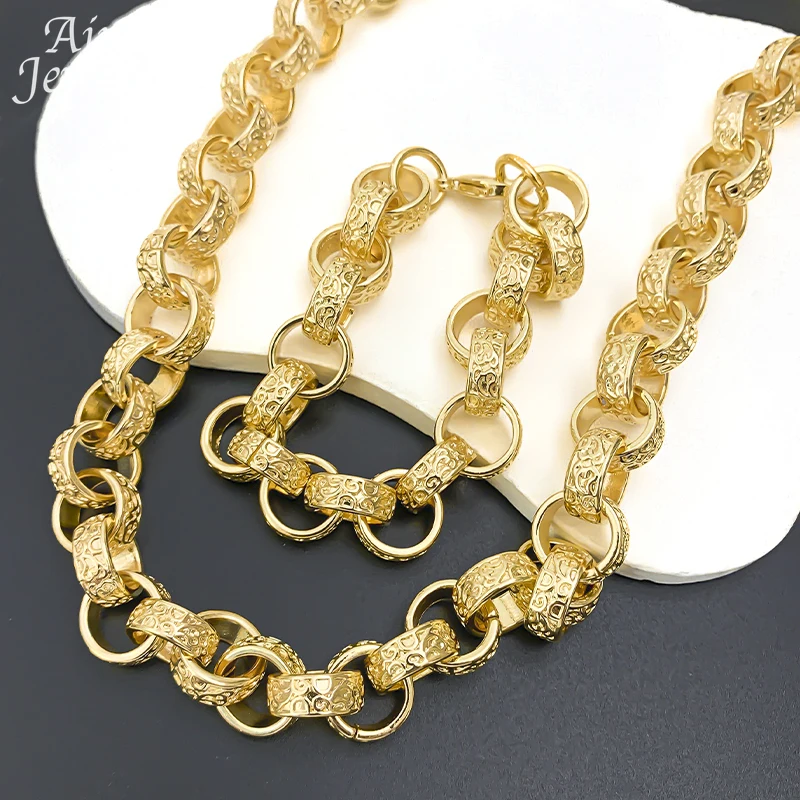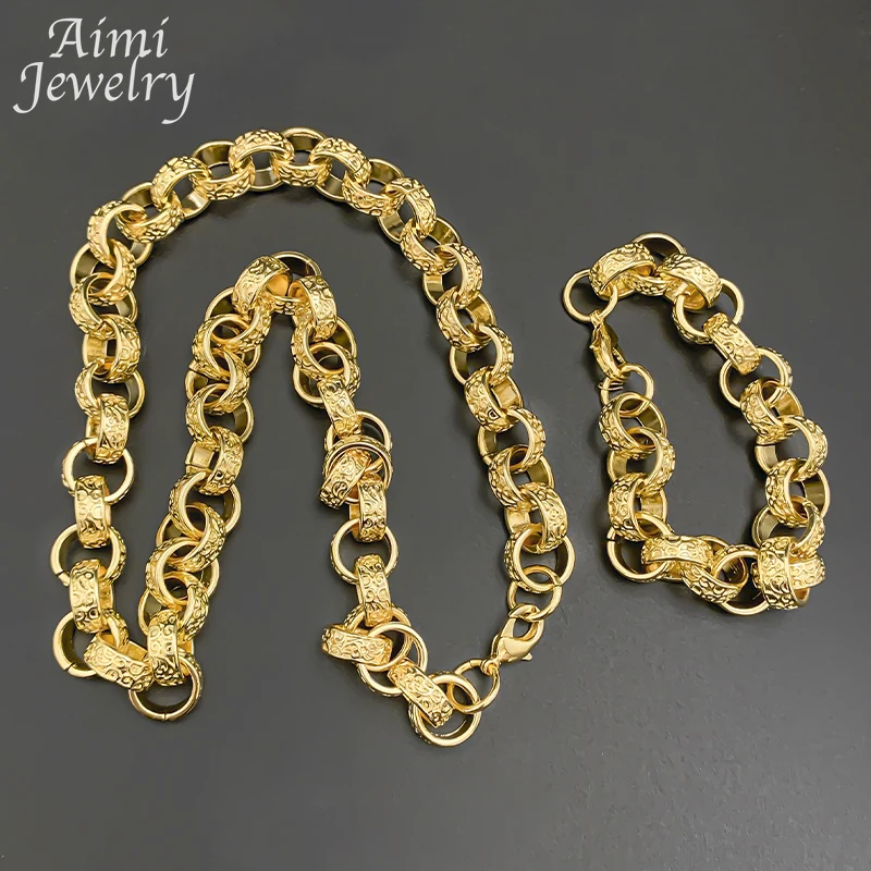 Bring bold energy to your look with this Hip Hop style chain jewelry set, featuring a long choker-style necklace and matching bracelet. Designed with a high-shine gold-plated finish, this set delivers eye-catching streetwear style with a luxe touch.