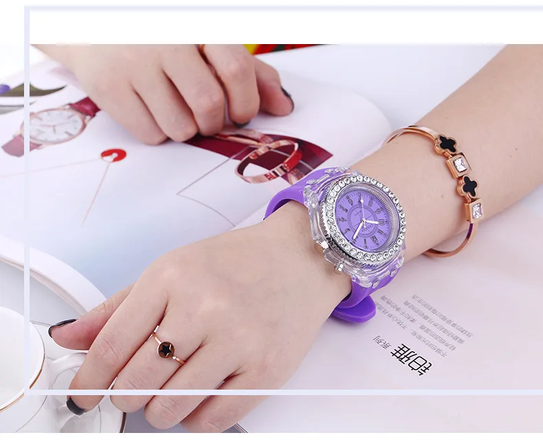 This trendy watch features colorful LED flashing lights, a soft silicone band for comfort, and rhinestone accents that bring extra shine.