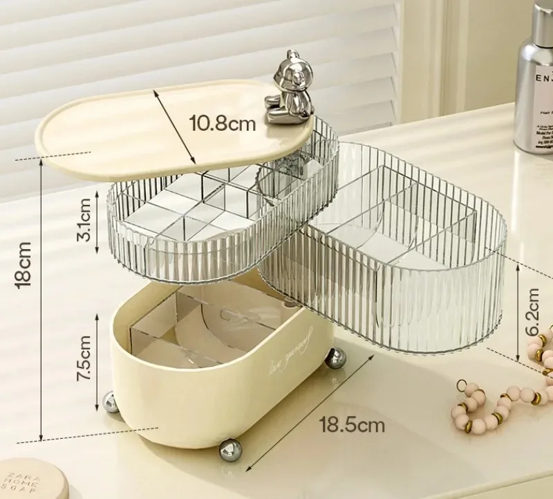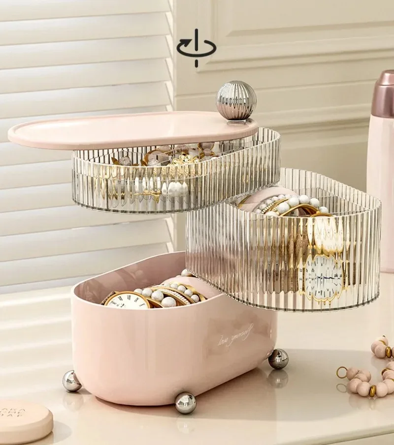 Elevate your vanity with this light luxury multi-layer storage rack, designed to keep your lipsticks, jewelry, and beauty essentials organized and dust-free. The 360° rotating design makes it easy to access everything you need while adding a touch of elegance to your dressing table.