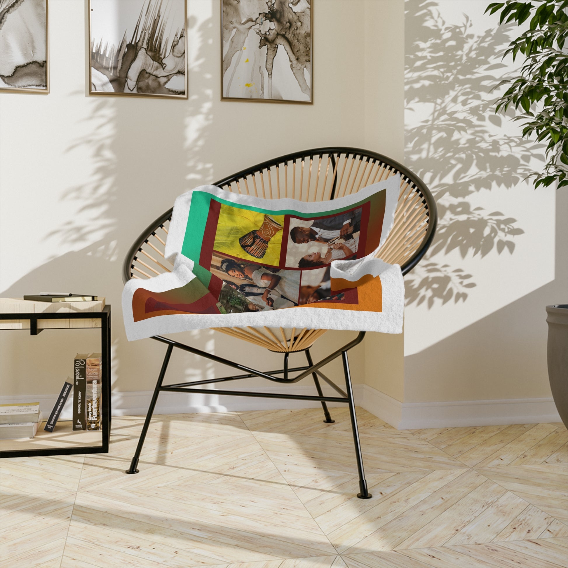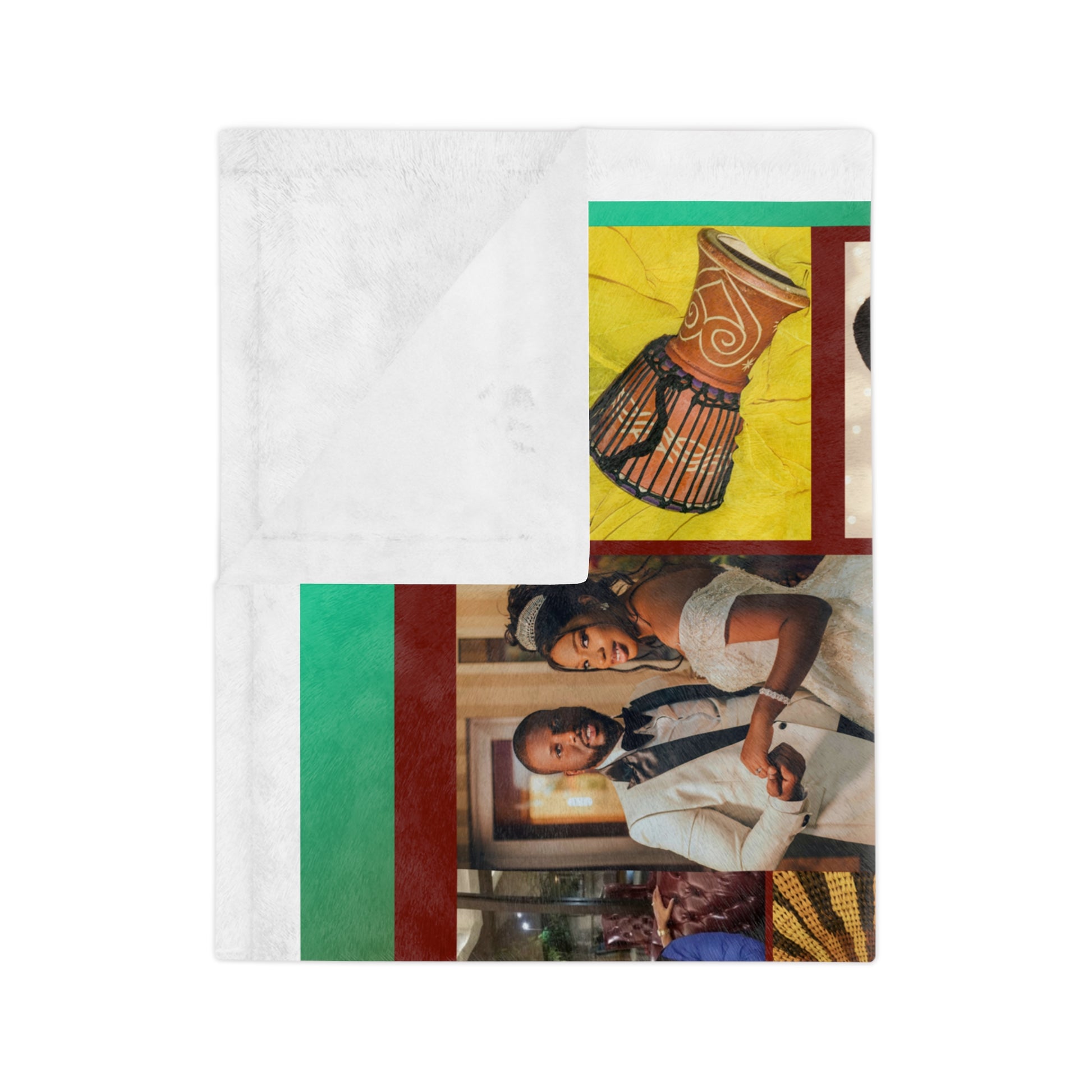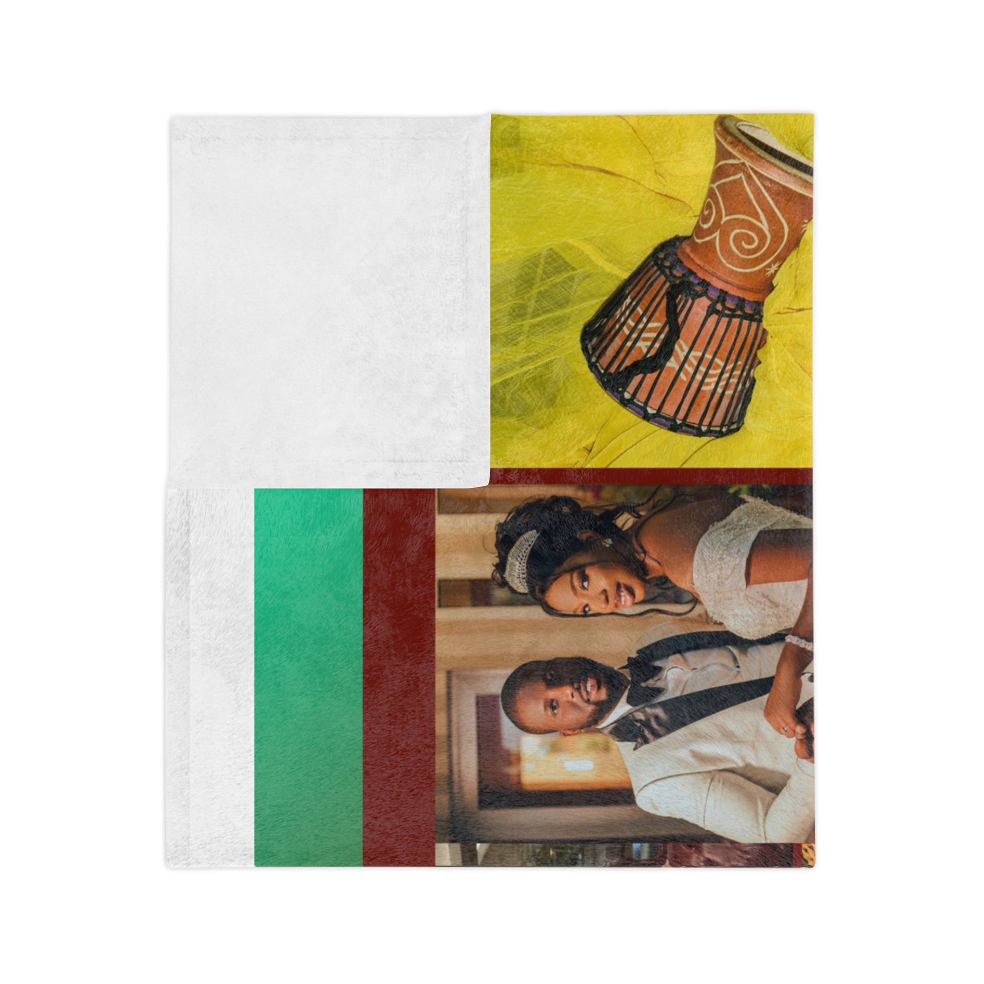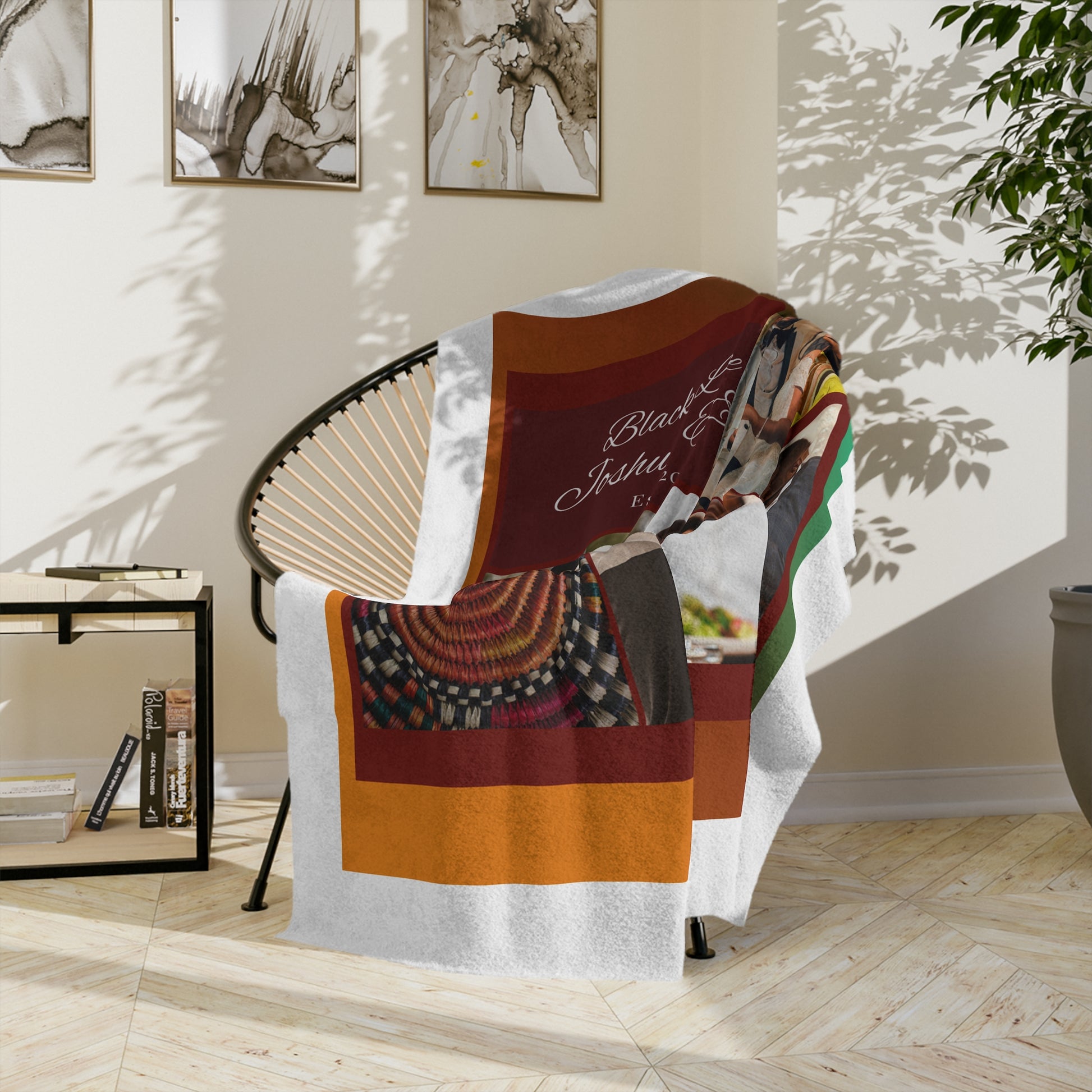 A velveteen microfiber blanket that wraps warm memories in rich color and plush comfort. The one-sided print shows a collage of intimate moments and cultural motifs framed by deep, earthy tones — like a keepsake quilt made for evenings on the couch or slow mornings with coffee. The fabric feels luxuriously soft against skin, yet holds up to everyday use thanks to durable, hemmed edges and quick-drying polyester. It drapes easily over shoulders or across a sofa, adding a personal, soulful touch to living rooms, photo displays, or cozy ceremony aftercare. This blanket reads like a story: each image and pattern invites lingering, conversation, and the quiet joy of being together.