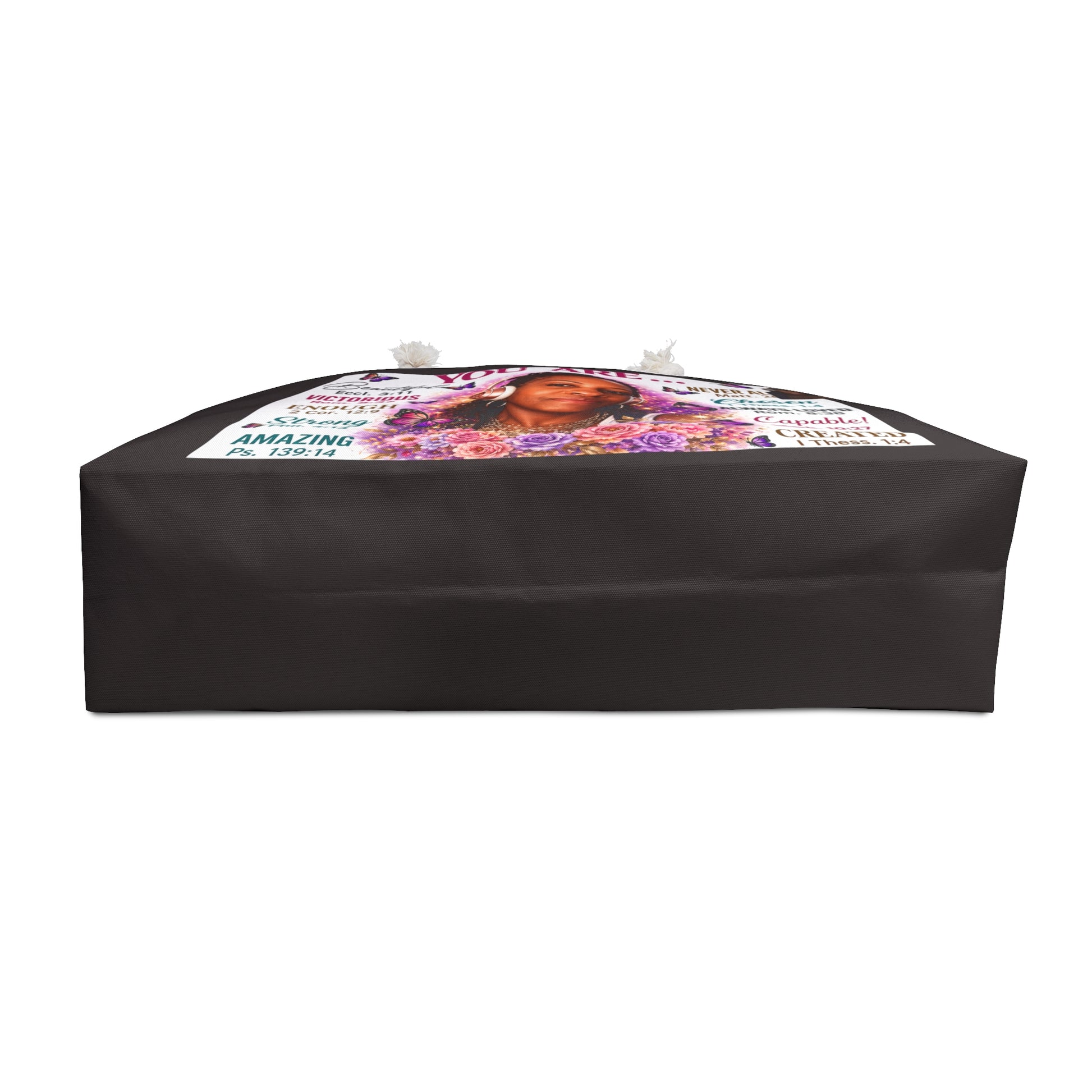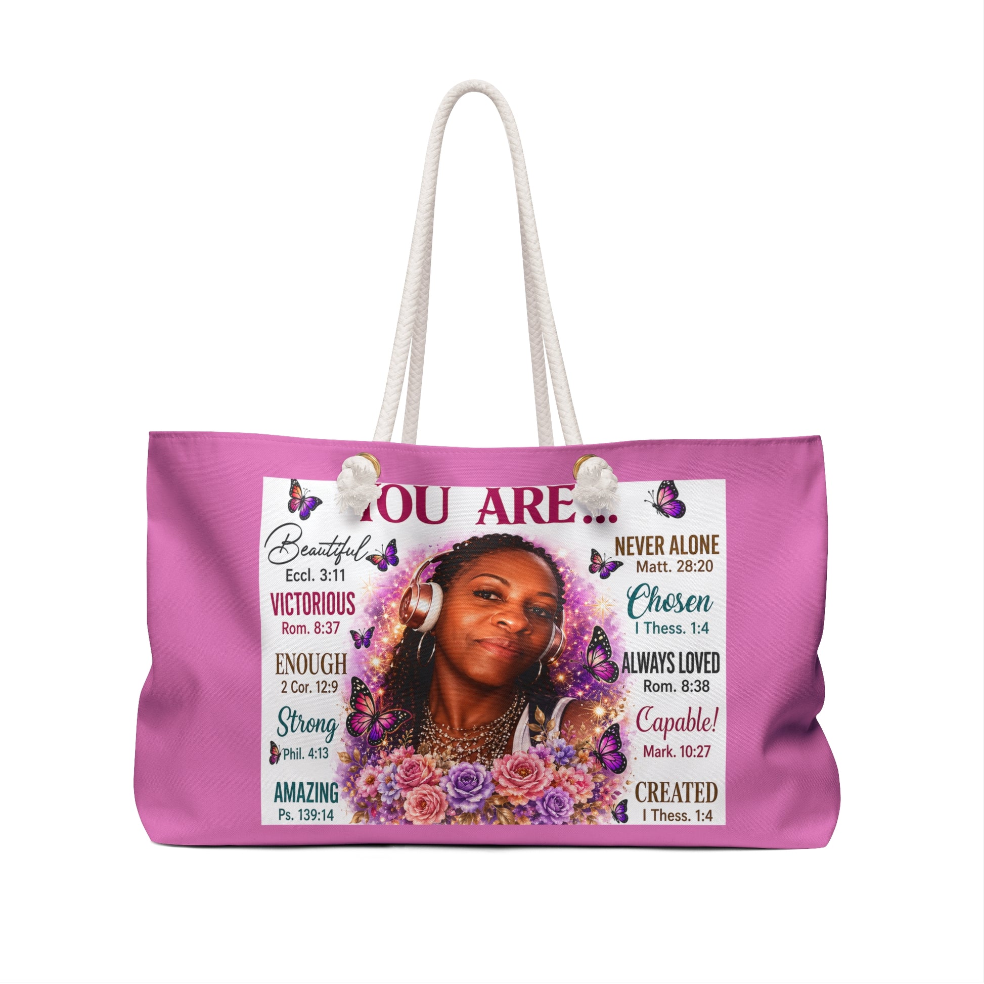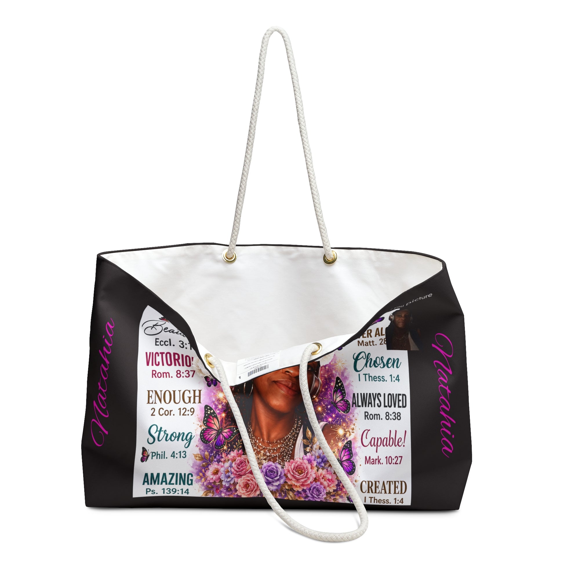 Add your likeness and name to this spacious weekender bag made for travel, errands, overnight stays, and meaningful gifting. The design features a warm portrait-style image surrounded by uplifting affirmations and soft floral accents, creating a personalized bag that feels both beautiful and empowering.