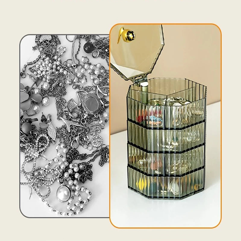 Our Rotating Jewelry Storage Box is the perfect solution for keeping your favorite earrings, bracelets, rings, and small makeup essentials neatly organized.